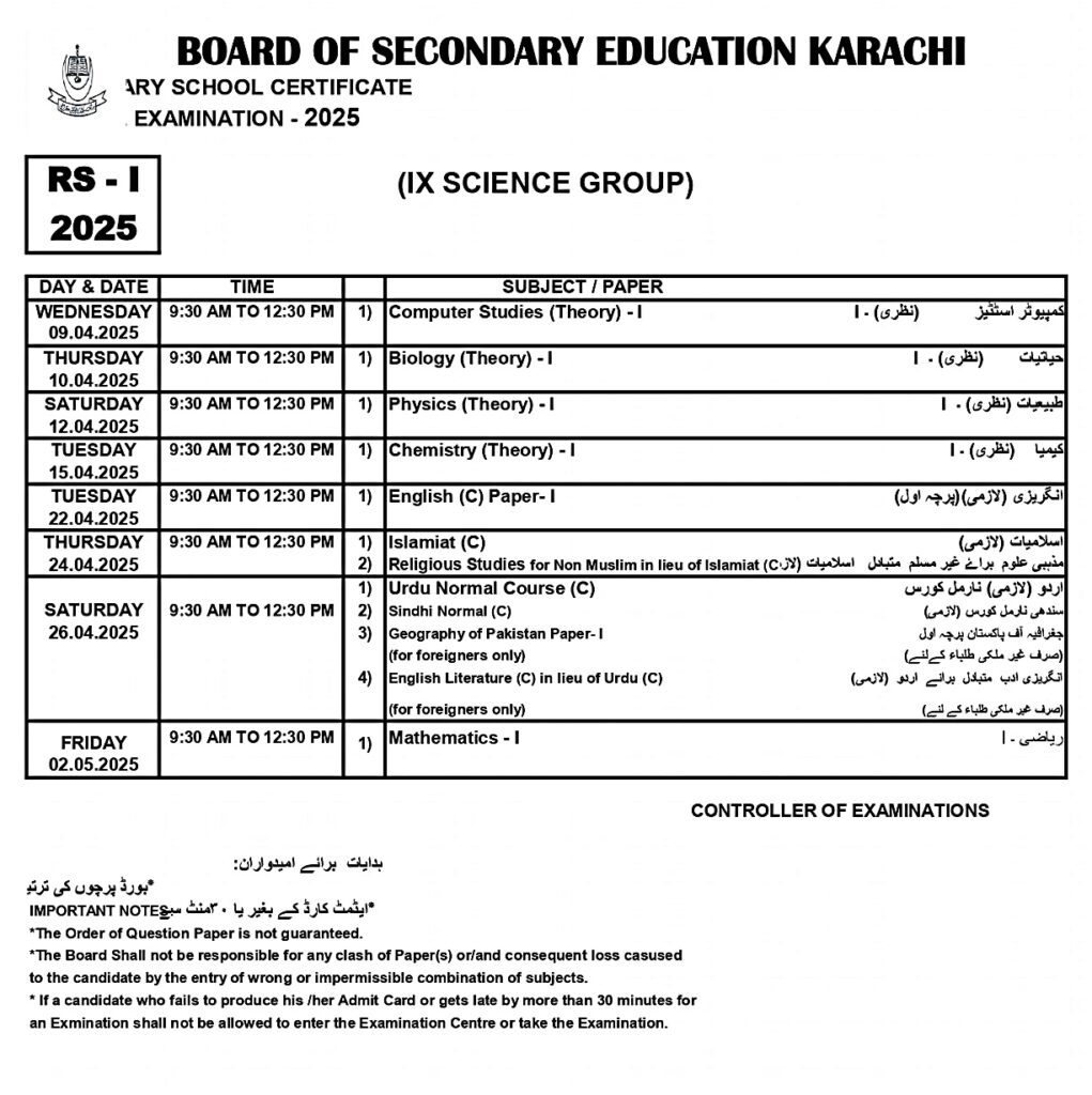 The Board of Secondary Education Karachi (BSEK) has officially released the 9th Class (IX Science Group) Annual Examination Date Sheet 2025. According to the schedule, the exams will commence from April 9, 2025, and will continue till May 2, 2025.
